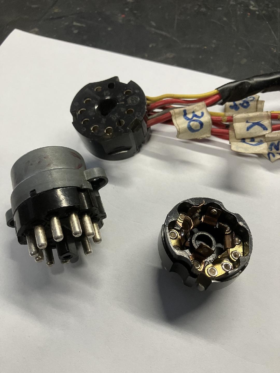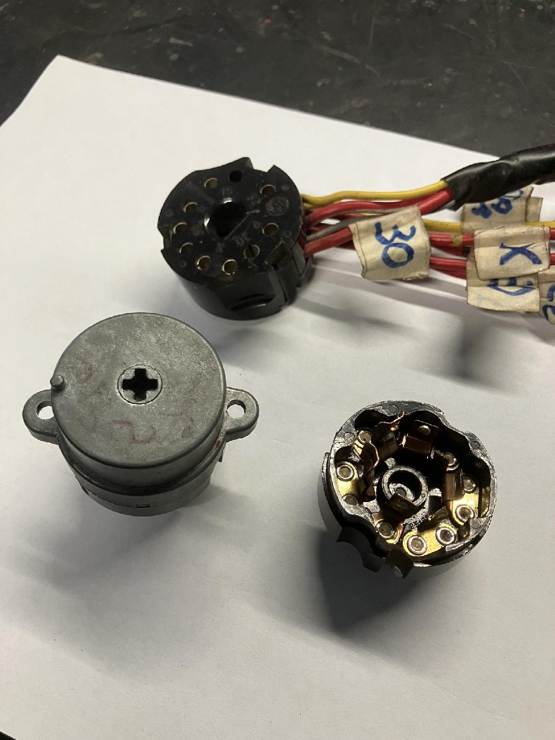 Mettre en ordre et vérifier que tout fonctionne bien au niveau électrique . Plus de 15 années d'immobilisation donc c'est nécessaire . La batterie , une batterie de 74 AH Varta 574 012 068 313 2 , cette batterie correspond aux dimensions et emplacement des bornes positive et négative . Le premier élément dans le circuit c'est le neiman ( contacteur à clé ) . Pas très compliqué , une grosse fiche sur le module , facilement débranchable . Par contre pour le module qui comprend le mécanisme avec les contacts , il faut faire de la gymnastique . J'ai volontairement ouvert un module qui était hors service pour montrer l'intérieur . Quand le neiman a un souci diagnostiqué , la cause est simple , le système mécanique avec la clé n'est pas la cause . La cause provient de ce bloc module qui se compose de contacteurs placés sur une platine tournante et elle couple des contacts qui sont sur une partie fixe . Ces contacts sont des languets de cuivre , certains petits d'autres grands et là se situe le problème . Le courant très important transite sur ces contacts et qui dit courant , il y a échauffement et de la dilatation ..... les languets plient avec le temps et ne permettent parfois plus le contact franc , d'où il y a panne . Pour faire simple , si vous avez un module nouveau complet il suffit de retirer la grosse fiche et brancher le module , à l'aide d'un tournevis actionner le module et donc confirmer la panne . Ensuite si le module est bien la cause , il faut se contorsionner et retirer le module en dévissant les deux vis .