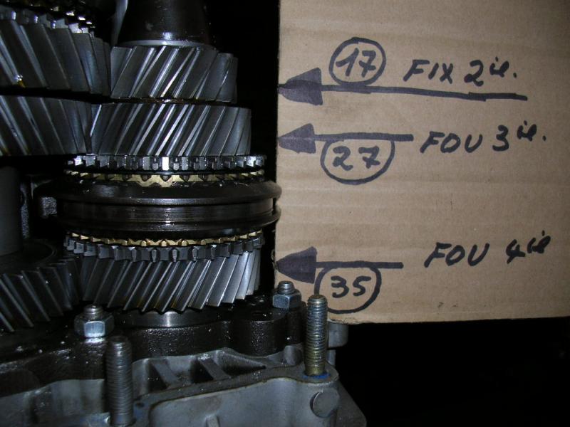 Le pignon fou sera bloqué sur son axe par un ensemble de bagues ( synchro et crabot , c'est ce qui se trouve sur la photo entre fou 3° et fou 4° ) celui-ci est solidaire de l'axe sur lequel il se trouve et se déplace en translation commandé par une fourchette pour finir par s'engager dans le pignon fou et solidarisera donc le pignon avec l'axe