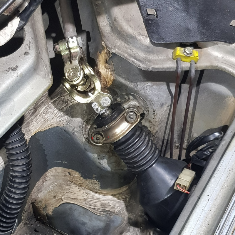 | Denis 74 | le 09/04/2026 à 19:47 Bonjour,Si le mouvement de rotation du volant est bien transmis sans jeu jusqu'à l'arbre d'entrée de la crémaillère (guidé par le palier à aiguilles) et que les roues ne tournent pas immédiatement il est fort probable que le flector soit hs. S'il n'y a pas l'évaporateur de la clim dans le petit coffre, comme le palier a aiguilles à été enlevé, en désaccouplant le cardan au niveau de l'arbre d'entrée de la crémaillère, il doit être possible de retirer le plastique de protection et avoir une vue sur le flector NB: il y a deux cardans dans la colonne de direction |